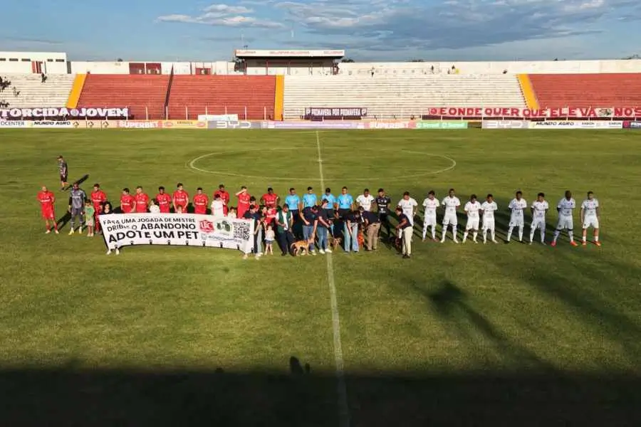 Antes do início da partida, os animais resgatados entraram em campo junto com a equipe do CIBEAR e os jogadores do União, acompanhados por uma faixa de conscientização com a mensagem “Faça uma jogada de mestre, drible o abandono e adote um pet”.